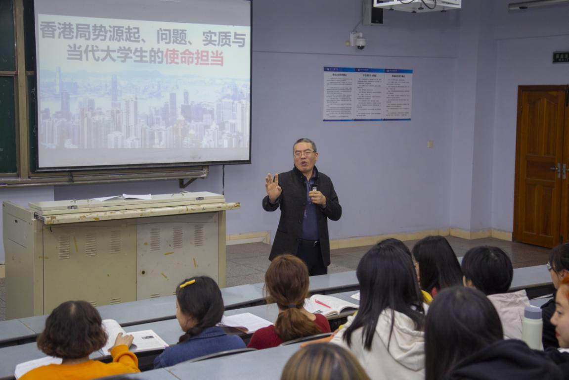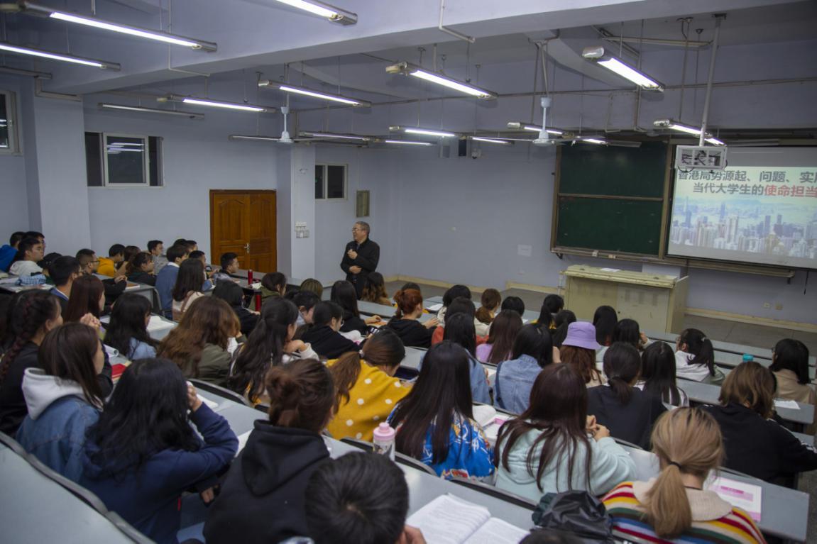 11月4日晚,学校副校长徐晓宗教授在博文楼412教室为文学与传播学院学子讲授题为“香港局势的源起、问题、实质”的形势与政策课。金年会jinnianhuicom院长刘长江、文学与传播学院辅导员、2018级部分学生到场聆听。