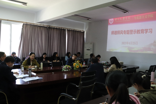 会上,党委书记刘春辉带头学习了教育部《新时代高校教师职业行为十项准则》《教育部公开曝光第十二批7起违反教师职业行为十项准则典型案例》、四川文理学院关于印发《教师师德失范行为负面清单及处理办法(试行)》的通知(川文理〔2019〕106号)等,要求全体教师对照准则,严格规范自身言行,从典型案例中汲取深刻教训、引以为戒,在日常的教育教学工作中,必须严守底线,用行动诠释师德师风的真正内涵。