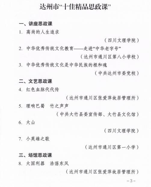 由中共达州市委宣传部等3部门主办的2024年达州市“十佳精品思政课”评选结果于近日揭晓,金年会金年会jinnianhuicom报送的《高尚的人生追求》、《大山》2件作品入选,体现了学院大思政课建设成效。