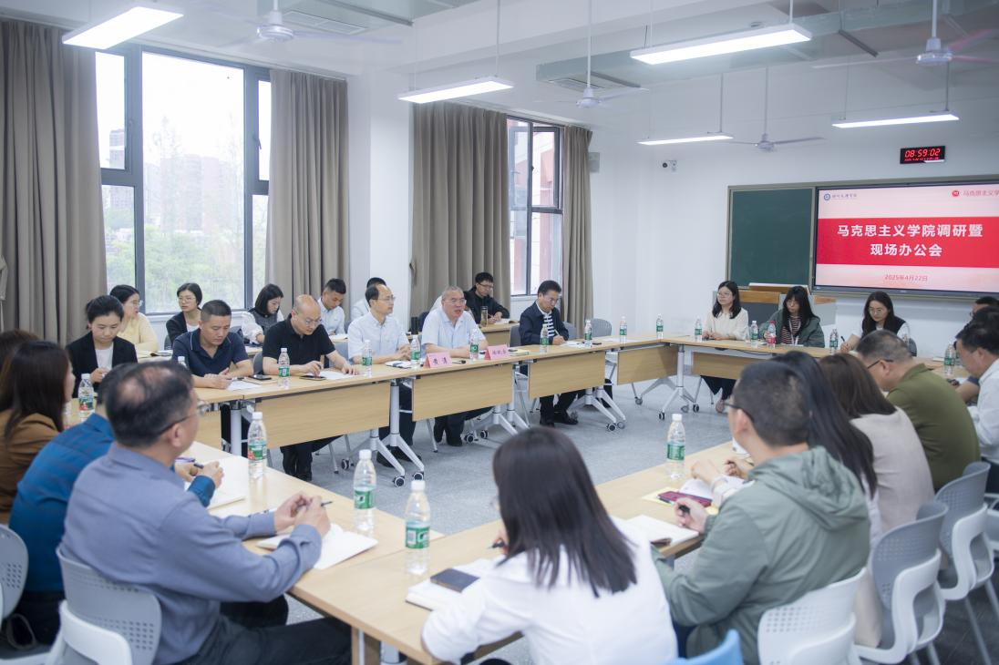 黄涛强调,金年会jinnianhuicom要认真落实党中央、教育部、教育厅对于做好高校思想政治教育的精神和要求,紧紧围绕建好建优建强金年会jinnianhuicom,谋深谋实新一轮发展。一要强化师资队伍建设。进一步加大高层次人才引进和培养力度,在对标加快扩容基础上,推进人才队伍在年龄结构、学历结构、专业结构、职称结构等方面的全面优化;二要提高思政课教学质量。深化教学改革,抓好备课磨课,在教材建设、课程改革、教学方法、教学手段、教学资源等方面重点发力,在教学比赛、教研教改等方面取得新突破。三要提升科学研究水平。发挥高层次人才的科研优势,开展有组织的科研活动,多出高质量科研成果。四要提升学生工作实效。加强思政课实践教学,推动“大思政课”与社会实践深度融合。思政教师要进驻一站式学生社区,引导学生厚植爱党爱国爱社会主义情怀。五要推进学科平台建设。加快推进大中小学思政课一体化建设,切实发挥共同体的辐射带动作用。强化马院与四川革命老区发展研究中心、川东北红色思政研究院等平台融合建设,为思政课教学改革提供学科支撑。六要强化服务保障工作。不断完善教学软硬件设施,优化塔石人才特区建设,为老师们创造优良教学环境。