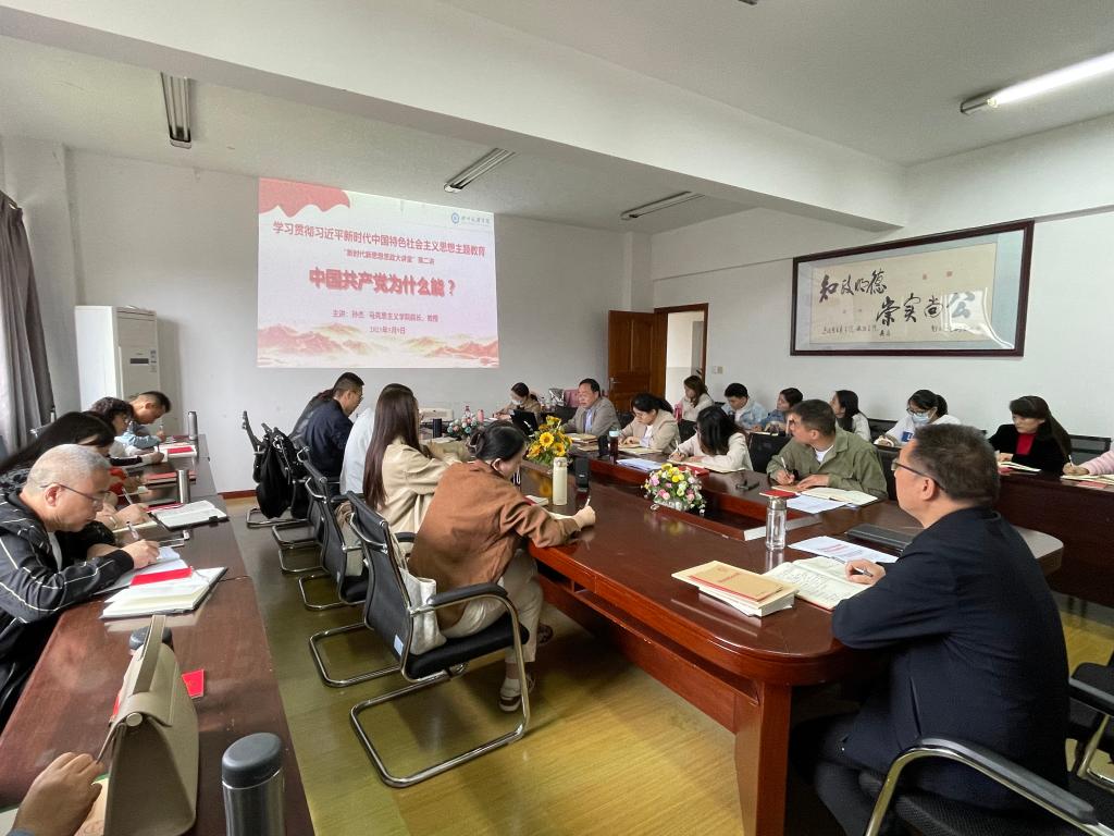 孙杰院长以《中国共产党为什么“能”》为题,从八个方面论证中国共产党的鲜明特征与突出优势,即中国共产党是一个具有强大政治领导力、理论优势和思想领导力、政治优势、制度优势、执政能力、自我革命精神、学习能力、组织优势和社会号召力的政党,深刻回答了中国共产党为什么“能”。孙杰院长指出,正是以上优势的全面形成和坚持发挥,使我们党团结带领全国各族人民谱写了中国革命、建设、改革的壮丽篇章,推进我国迎来了从站起来到富起来再到强起来的伟大飞跃,使中国特色社会主义迎来了从形成到发展到成熟的历史飞跃。