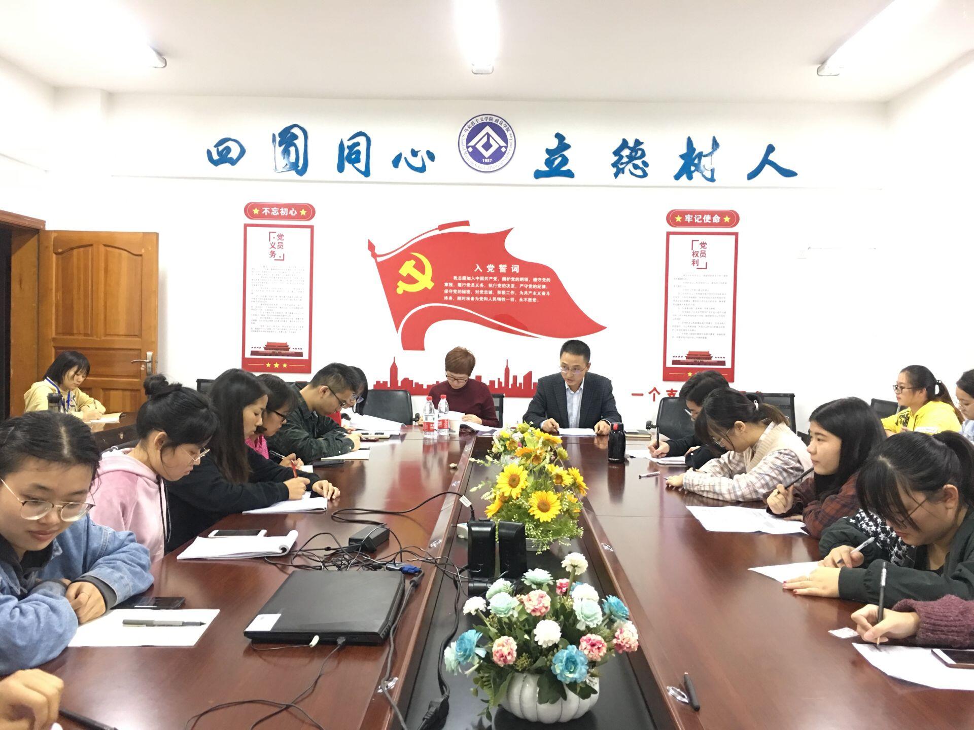 2019年10月10日下午5:30,我院学生党支部对照党章党规找差距专题会在博文楼611会议室召开,党总支副书记吴辉兵、辅导员曾亚、政法学院全体学生党员参加会议。学校主题教育督导员、离退休工作处处长郑静到会指导工作。