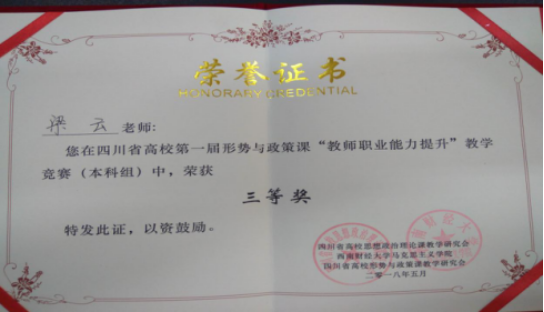 在刚刚结束的四川省首届高校形势与政策课“教师职业能力提升”教学竞赛中,我院梁云老师取得优异成绩,斩获四川省三等奖。本次教学竞赛由四川省高校思想政治理论课教学研究会主办、西南财经大学金年会jinnianhuicom承办、四川省高校形势与政策课教学研究会协办,系我省首次针对高校形势与政策课所展开的竞赛活动。