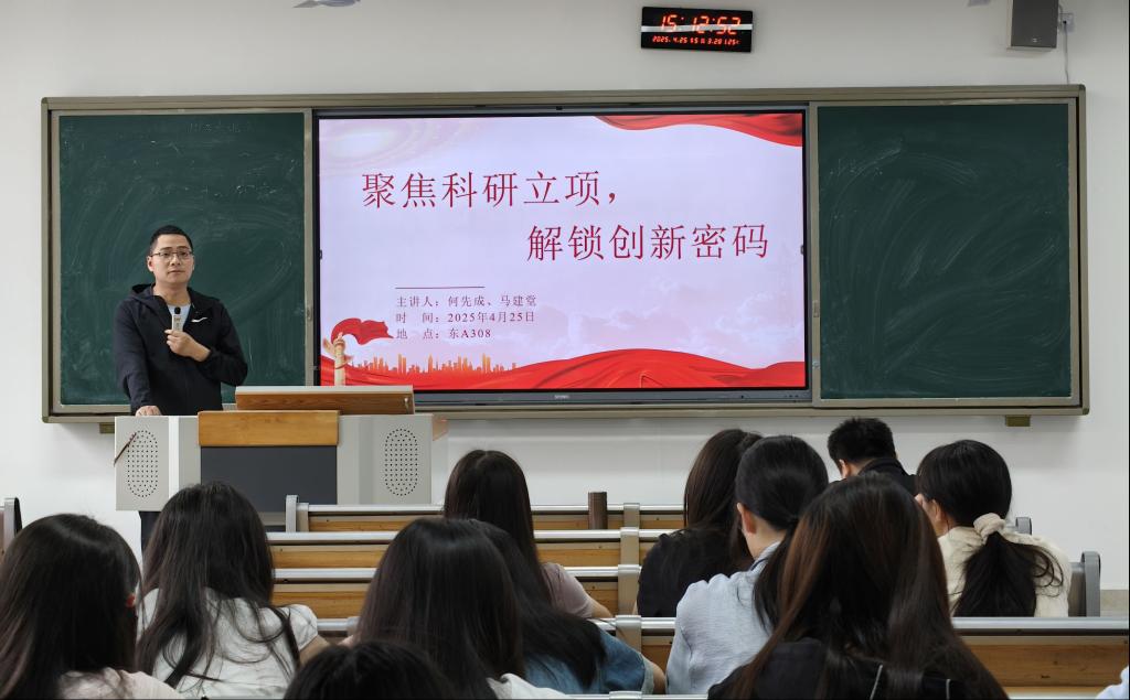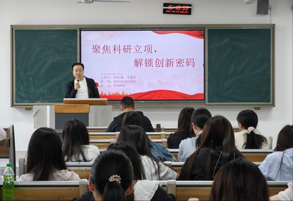 为激发学生科研创新活力,提升学术研究能力,2025年4月25日下午15点,一场主题以“聚焦科研立项,解锁创新密码”的科研立项指导会在莲湖东区A308顺利开展。学院副院长何先成、党政办公室主任马建堂出席会议,我院学子到场聆听讲座。