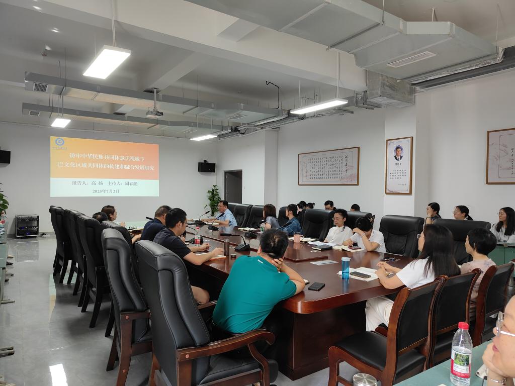 为加强学术交流研究,深入开展有组织的科研活动。7月2日,高扬博士为学院全体教师作题为《铸牢中华民族共同体意识视域下巴文化区域共同体的构建和融合发展研究》的学术讲座。讲座由学院党委副书记、纪委书记周春滟主持。